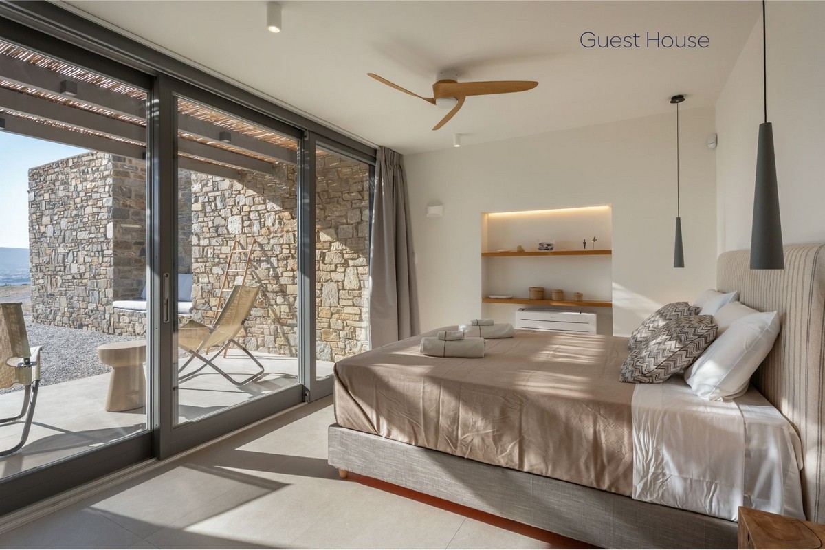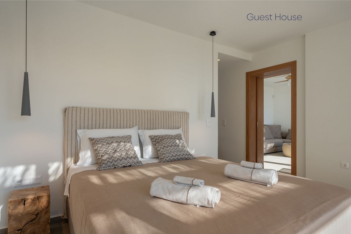 The guest house features one bedroom with a queen-sized bed and a private en-suite bathroom, alongside a separate living area where two sofas convert into two additional comfortable beds, each with its own en-suite bathroom. Interiors are elegant and airy, with soft white tones, clean lines, and subtle Cycladic touches, creating a serene and sophisticated atmosphere. Outdoor spaces include private verandas with pergolas and seating areas, perfect for morning coffee or sunset drinks overlooking the sparkling Aegean Sea.