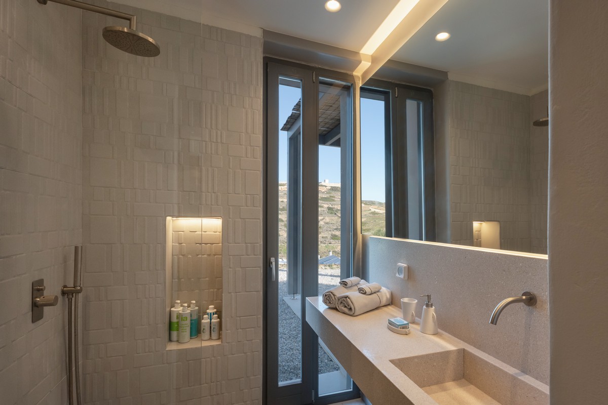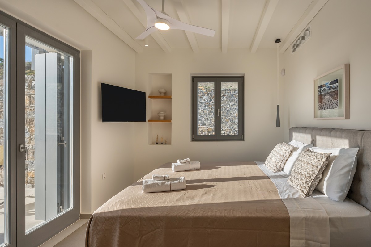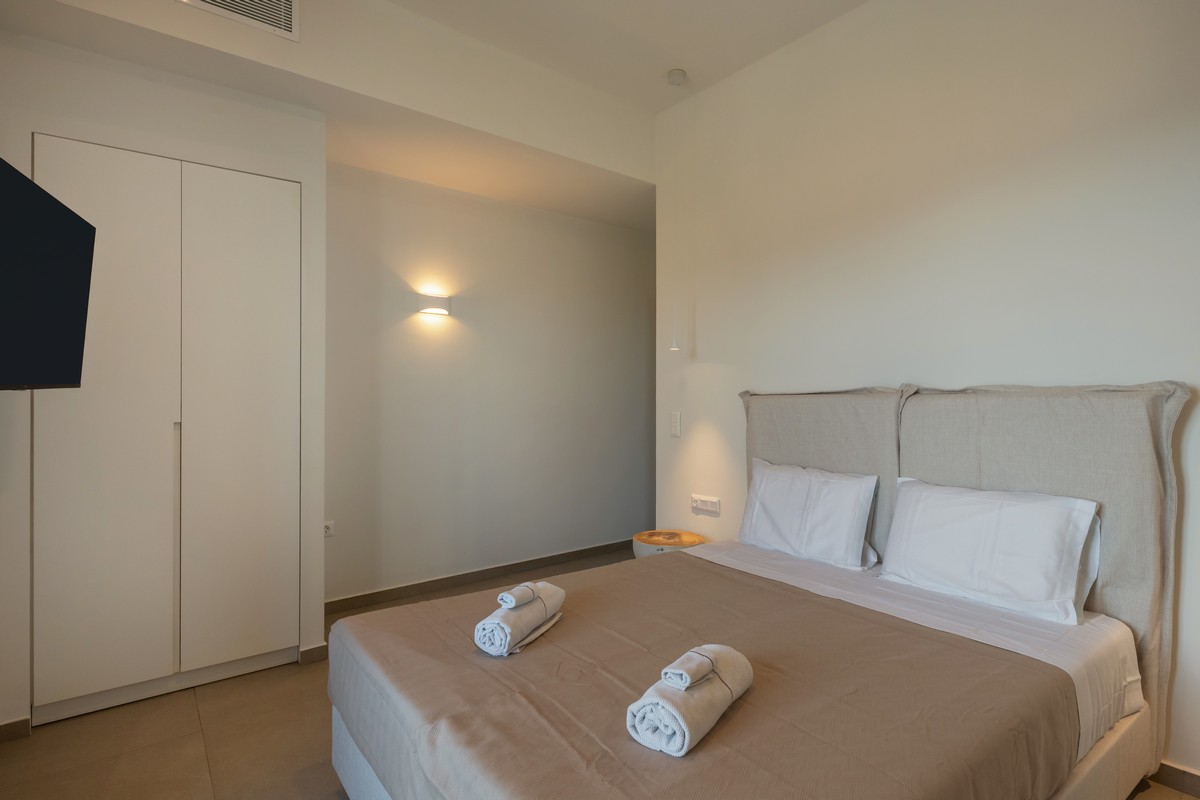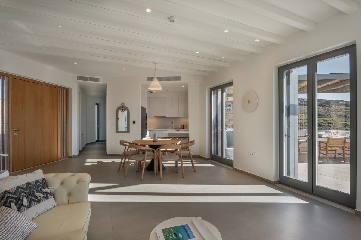 The main entrance opens into a luminous open-plan living and dining area, where natural light floods the space and flows effortlessly to the exterior, creating the perfect indoor–outdoor experience. The villa features three beautifully appointed bedrooms, each with its own en-suite bathroom. The master bedroom offers a king-size bed and direct access to a private veranda with jacuzzi overlooking the pool and the sea. Two additional bedrooms feature queen-size beds and en-suite bathrooms, with one enjoying uninterrupted sea views and the other a serene outlook over a charming olive tree garden. Each bedroom opens onto a private veranda shaded by a pergola, enhancing privacy and connection with nature.