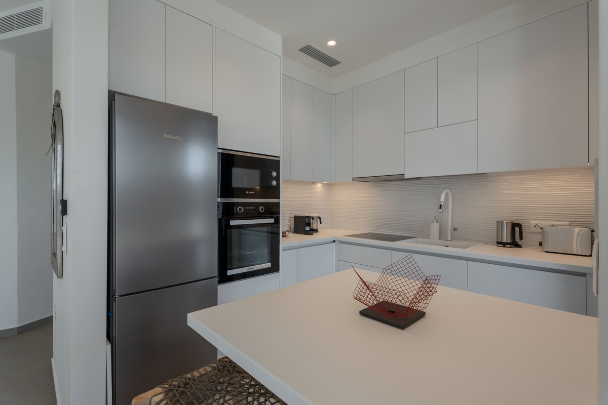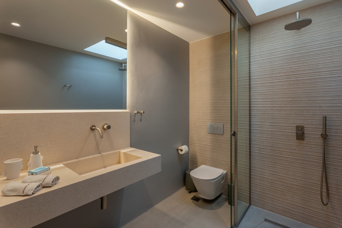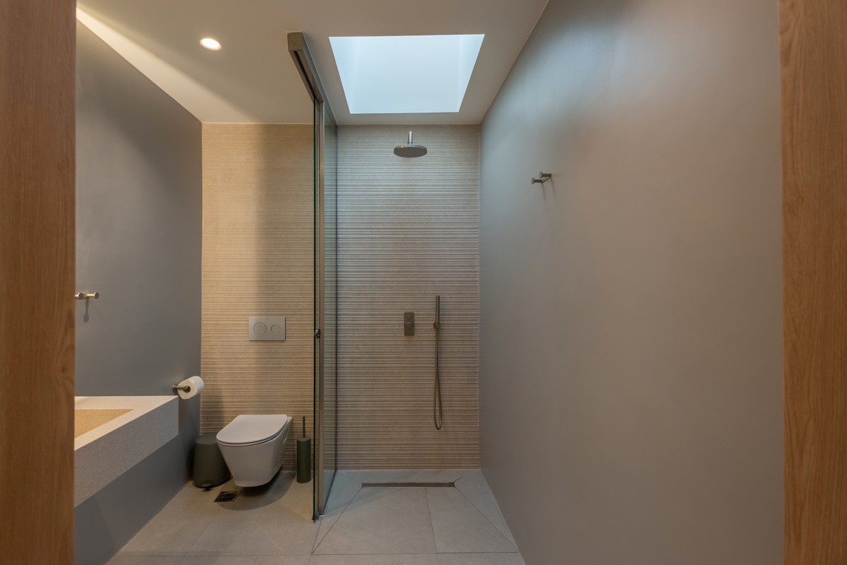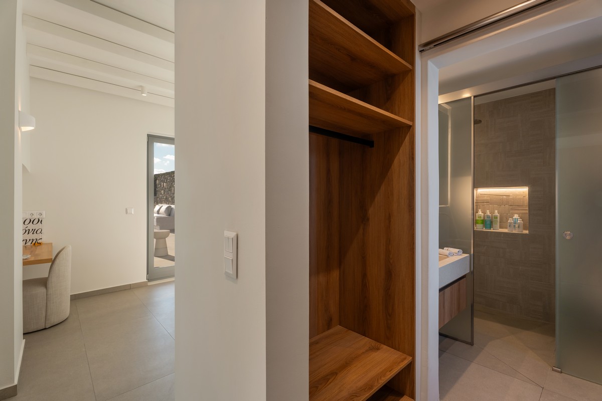 The main entrance opens into a luminous open-plan living and dining area, where natural light floods the space and flows effortlessly to the exterior, creating the perfect indoor–outdoor experience. The villa features three beautifully appointed bedrooms, each with its own en-suite bathroom. The master bedroom offers a king-size bed and direct access to a private veranda with jacuzzi overlooking the pool and the sea. Two additional bedrooms feature queen-size beds and en-suite bathrooms, with one enjoying uninterrupted sea views and the other a serene outlook over a charming olive tree garden. Each bedroom opens onto a private veranda shaded by a pergola, enhancing privacy and connection with nature.