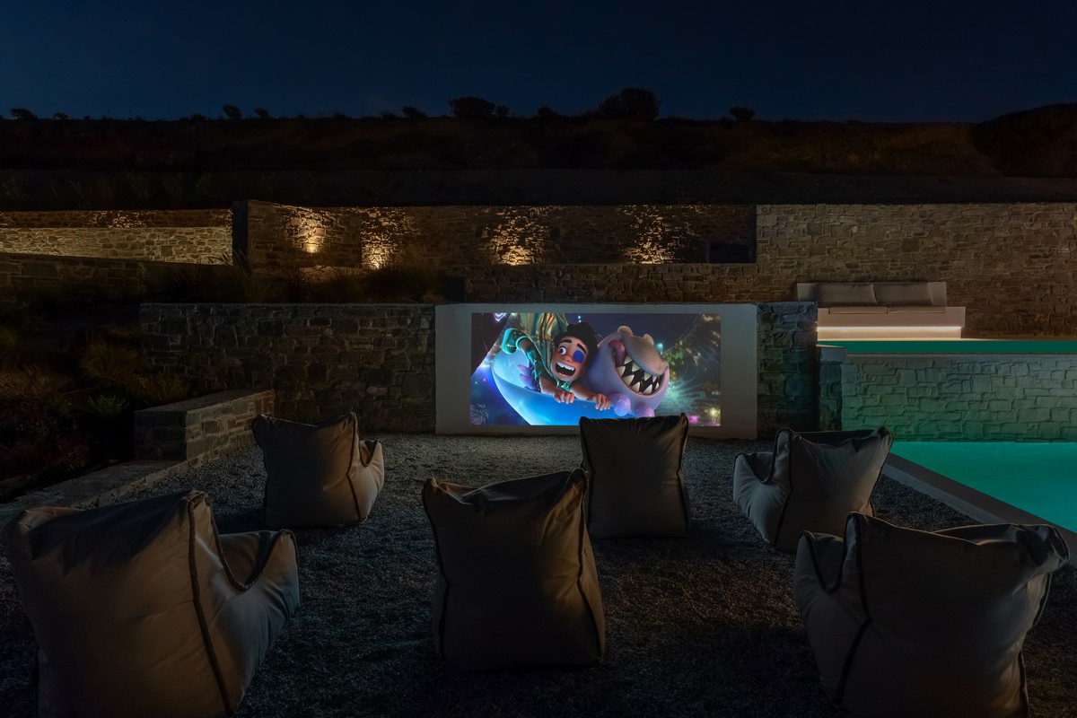 Outdoors, the villa’s infinity pool appears to merge with the horizon, accompanied by a children’s pool, two lounge areas with luxurious sunbeds, and a spacious dining area with BBQ, ideal for relaxed summer gatherings. As night falls, the villa’s open-air cinema provides a magical setting for unforgettable evenings under the stars.