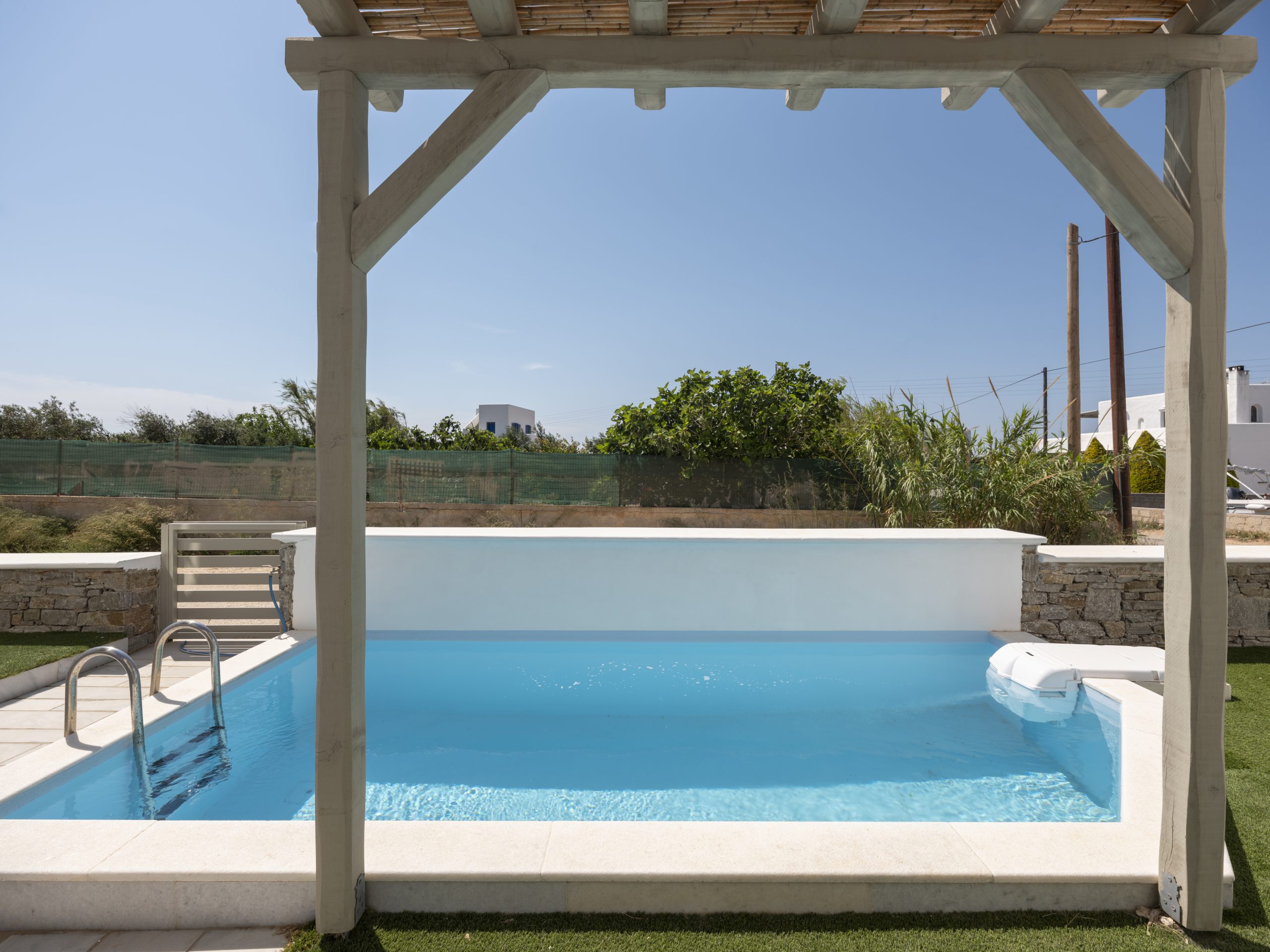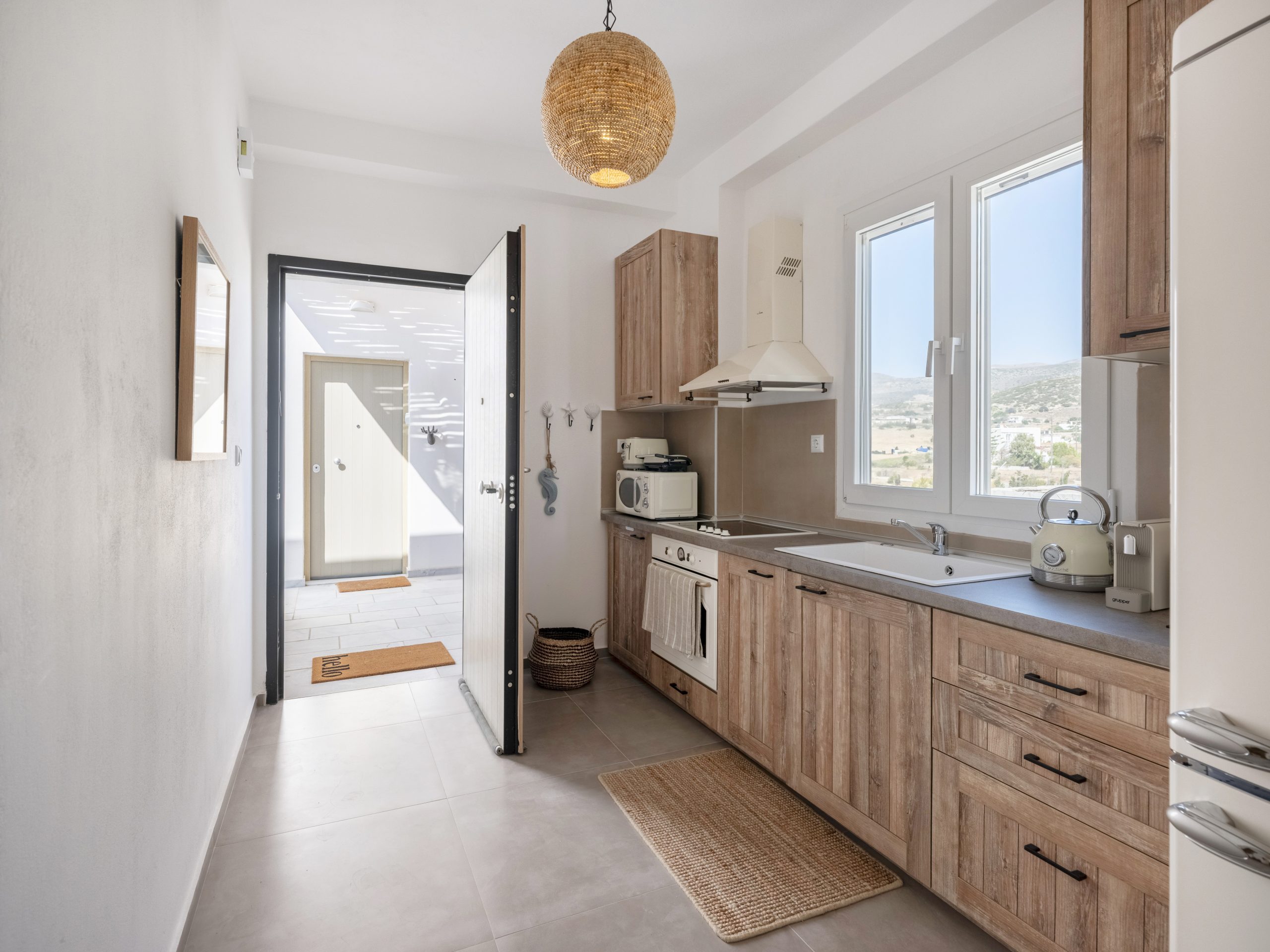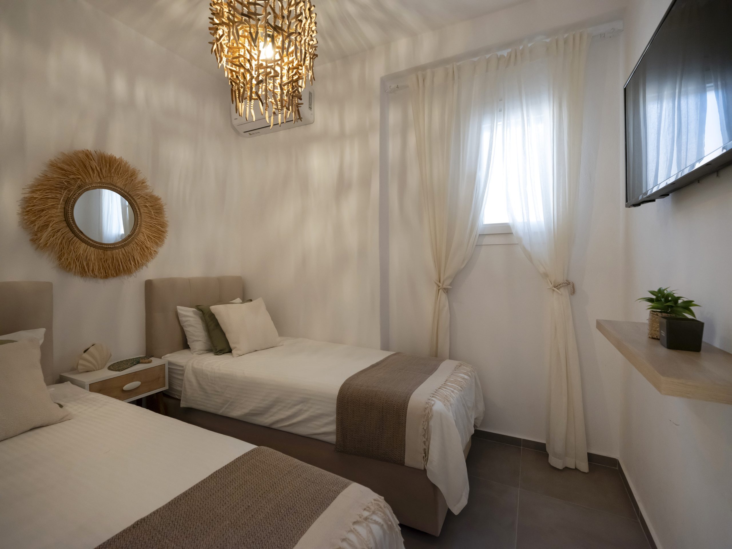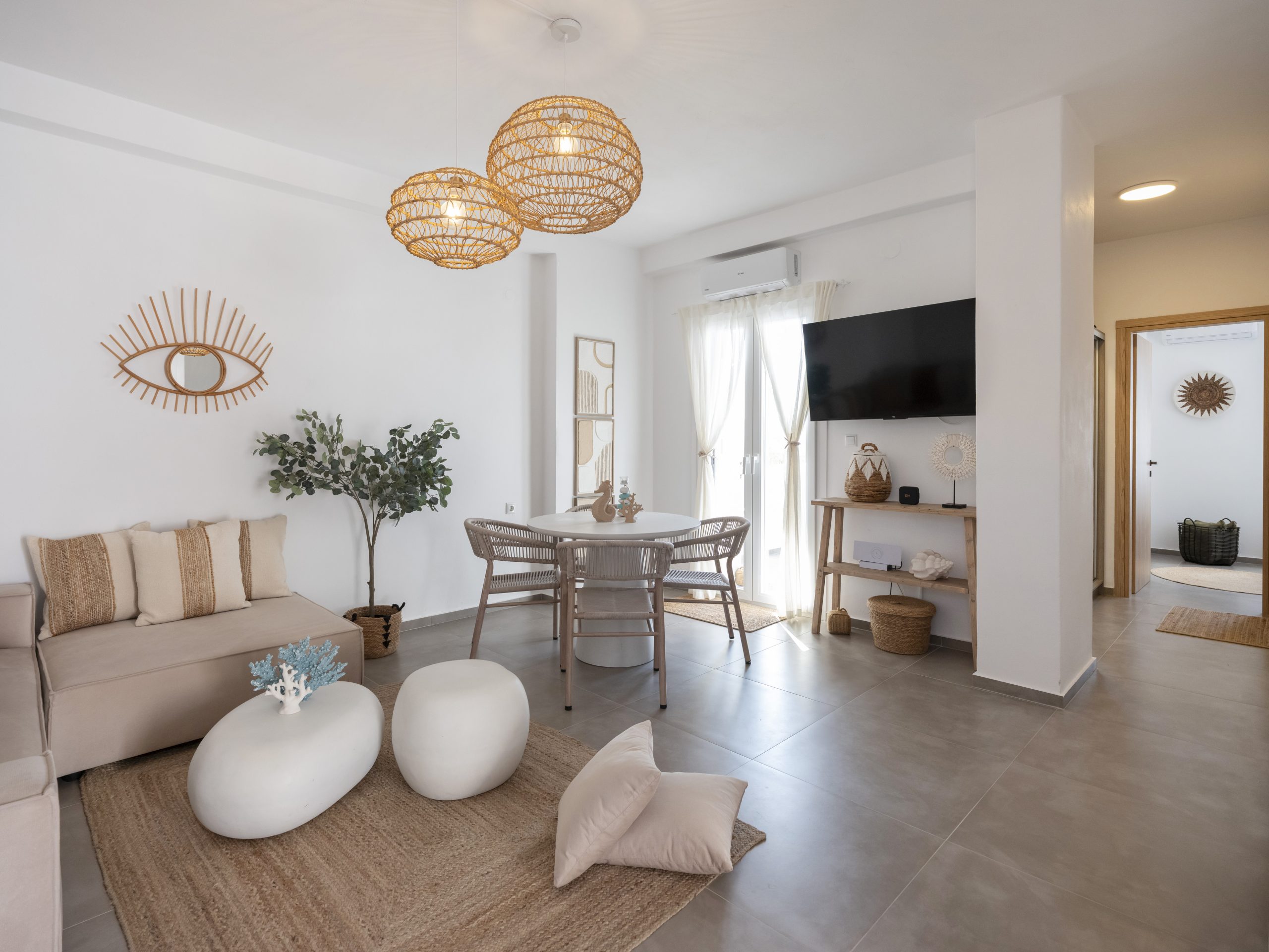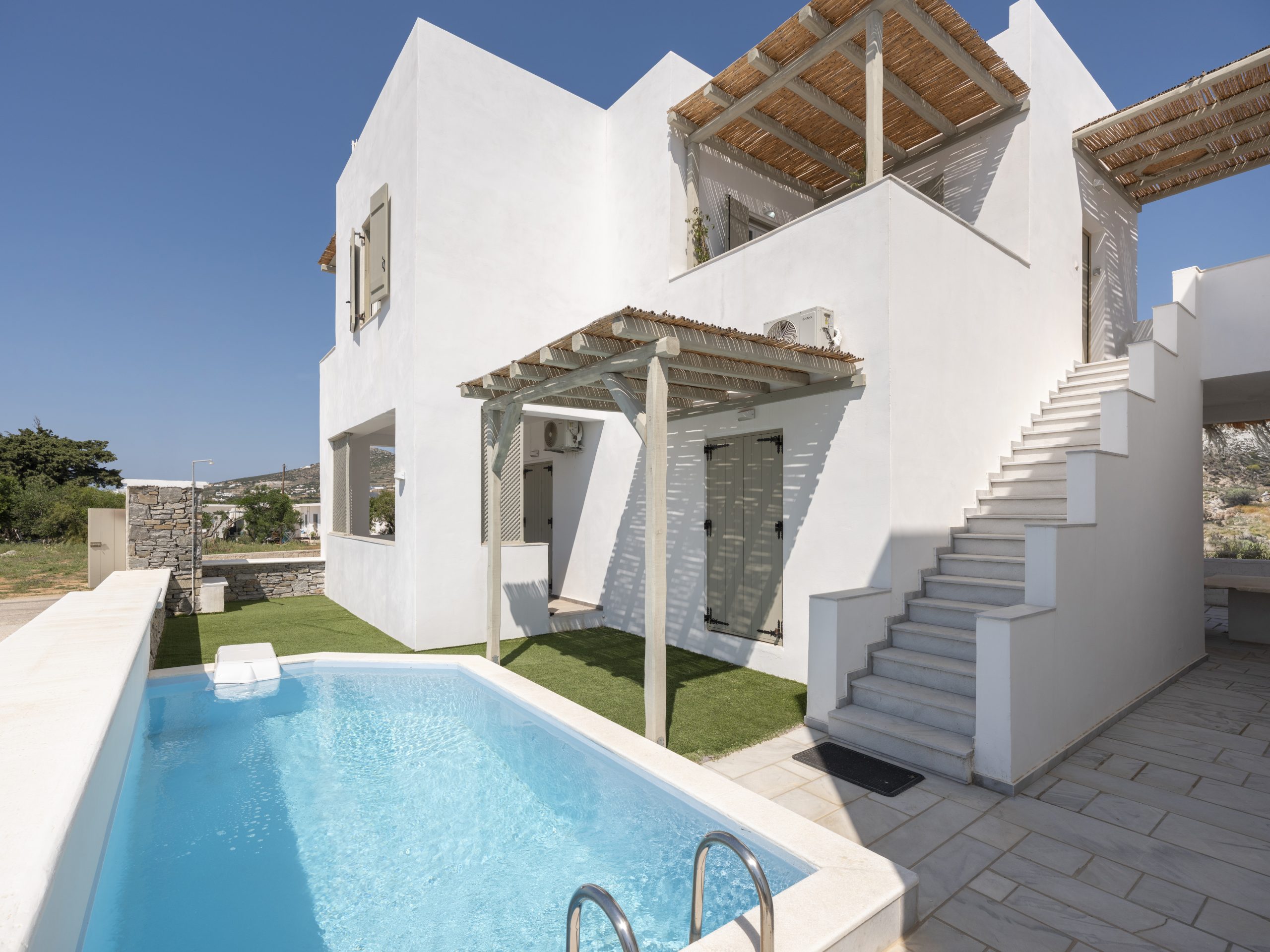Guests can enjoy a private patio and access to a shared swimming pool, perfect for warm summer days. Private parking ensures convenience and peace of mind. A reliable high-speed internet connection make Fiora I suitable for remote work, allowing guests to stay productive while immersed in the Aegean lifestyle.