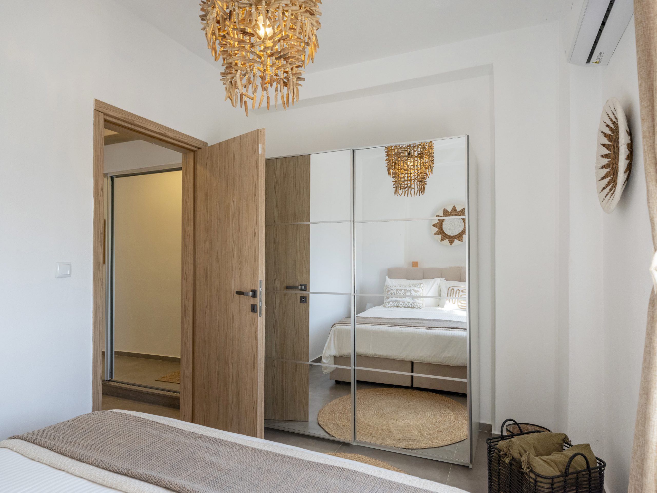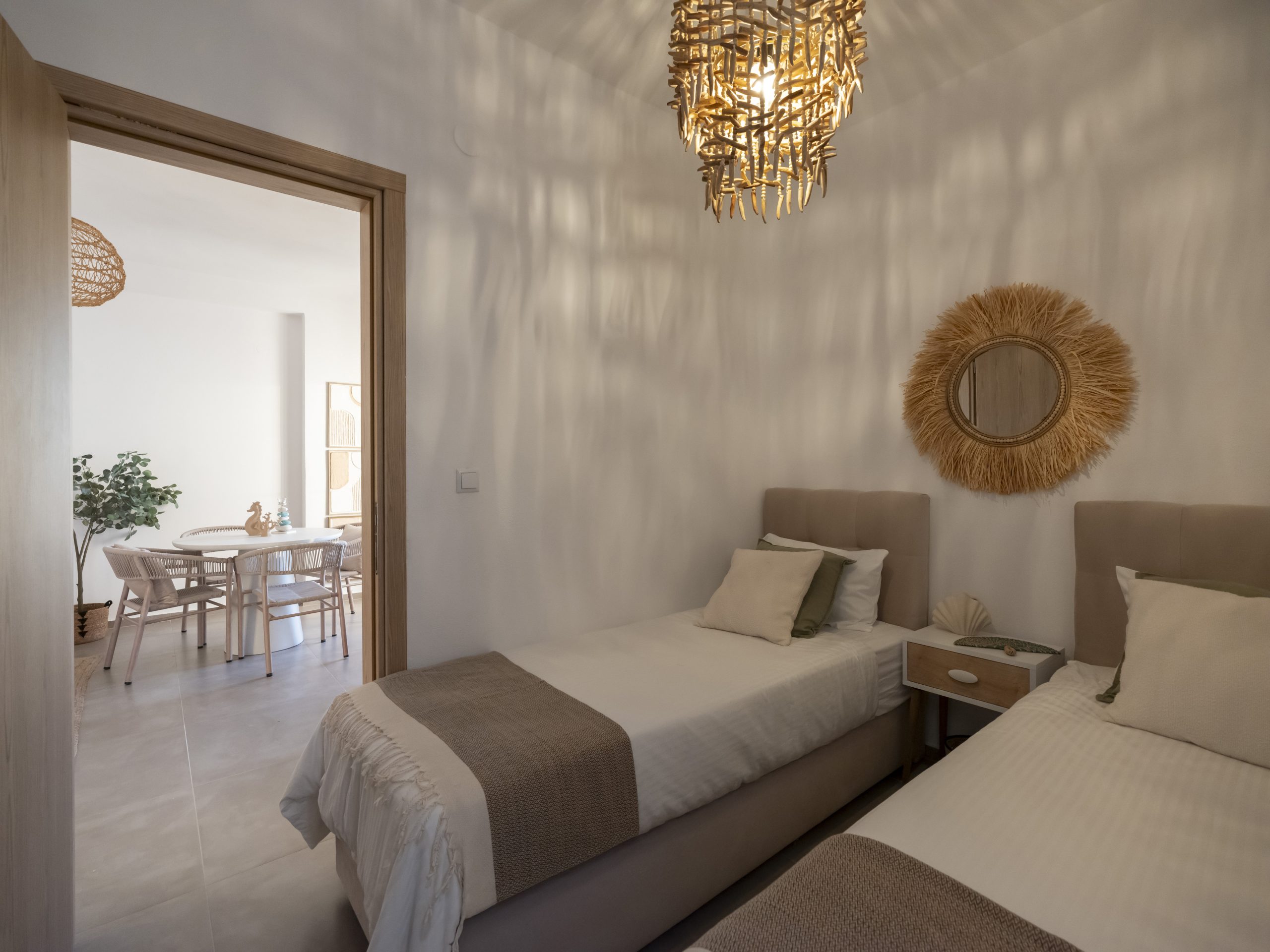 The house features two bedrooms, one with a double bed and one with two single beds, alongside a fully equipped bathroom, a cozy living room, and a functional kitchen. Interiors are bright and airy, with soft tones and natural materials, creating a serene and inviting atmosphere.