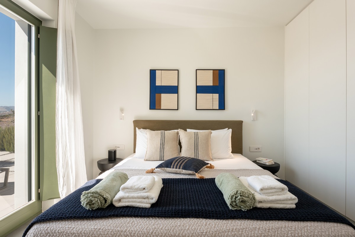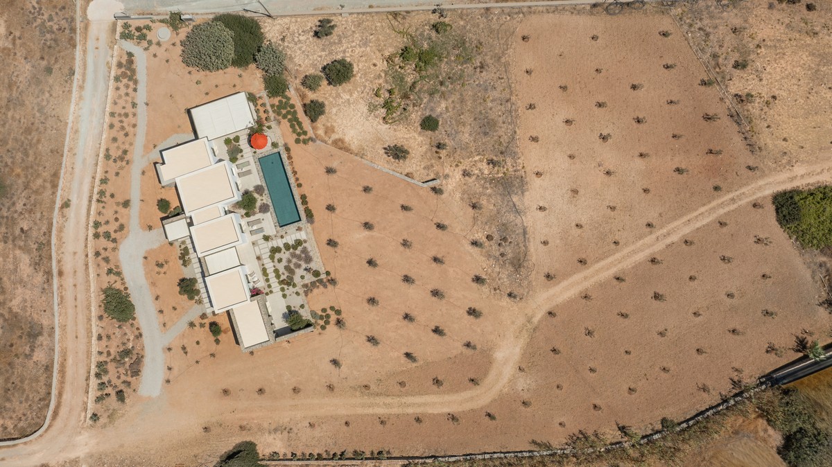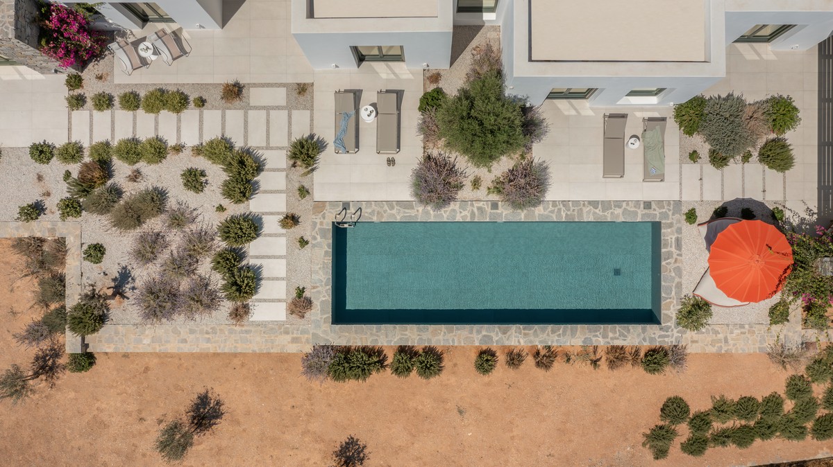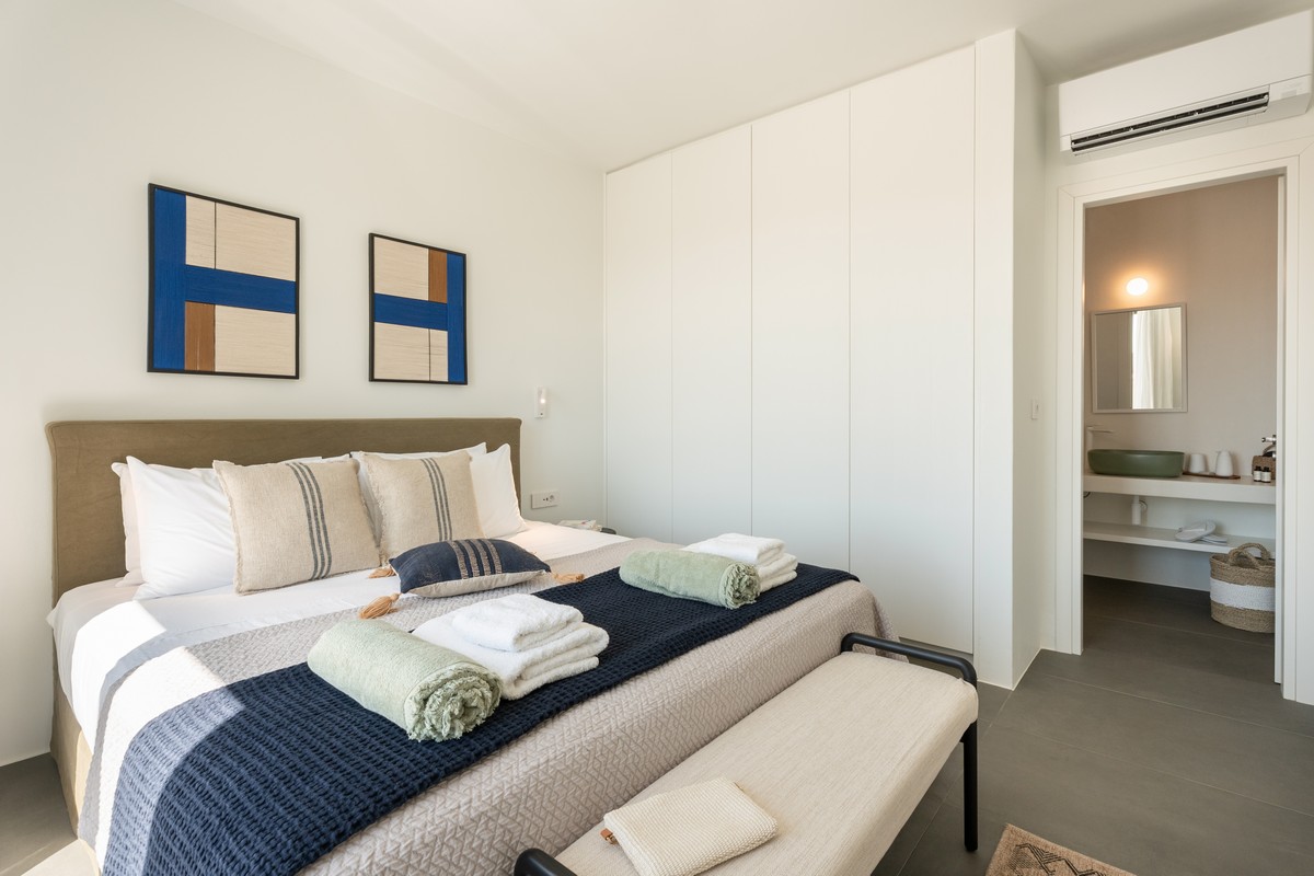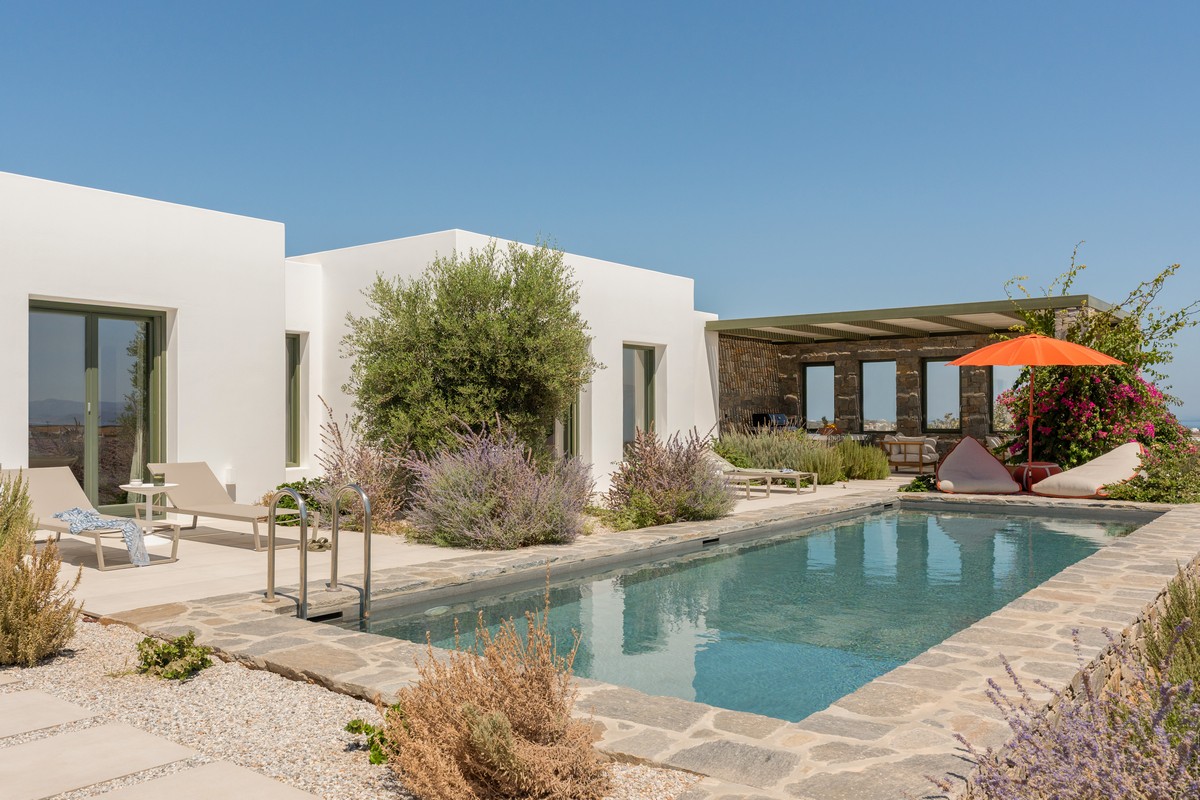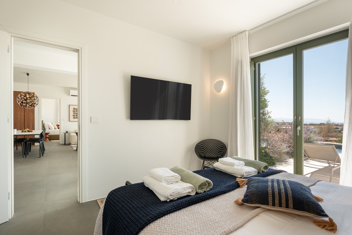 The property consists of a main house and two independent studios. The main house includes two bedrooms , one with a king-size bed and one with a queen-size bed , both with en-suite bathrooms, alongside a bright open-plan living and dining area and a fully equipped modern kitchen. Each of the two studios features a bedroom with a queen-size bed and en-suite bathroom. All bedrooms provide direct access to the pool and are designed with soft tones, natural materials, and large windows that fill the interiors with natural light, creating a serene and sophisticated atmosphere.