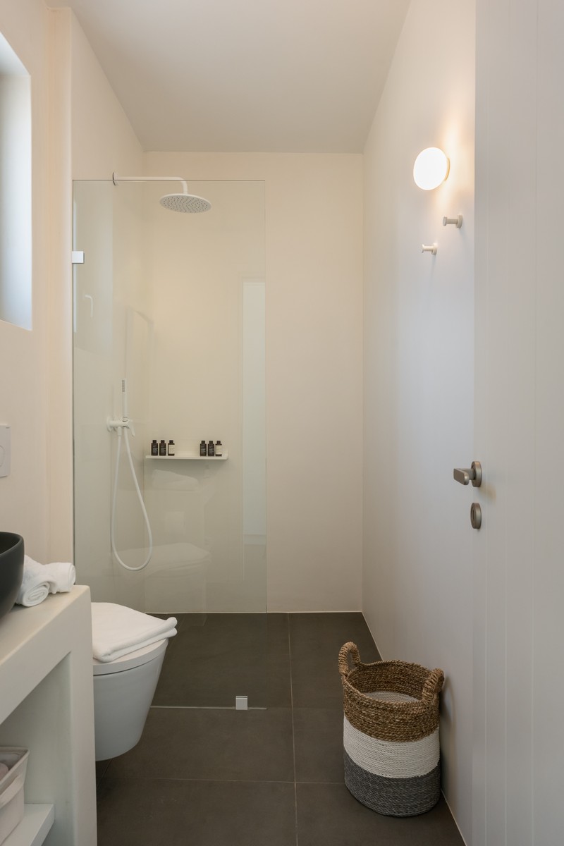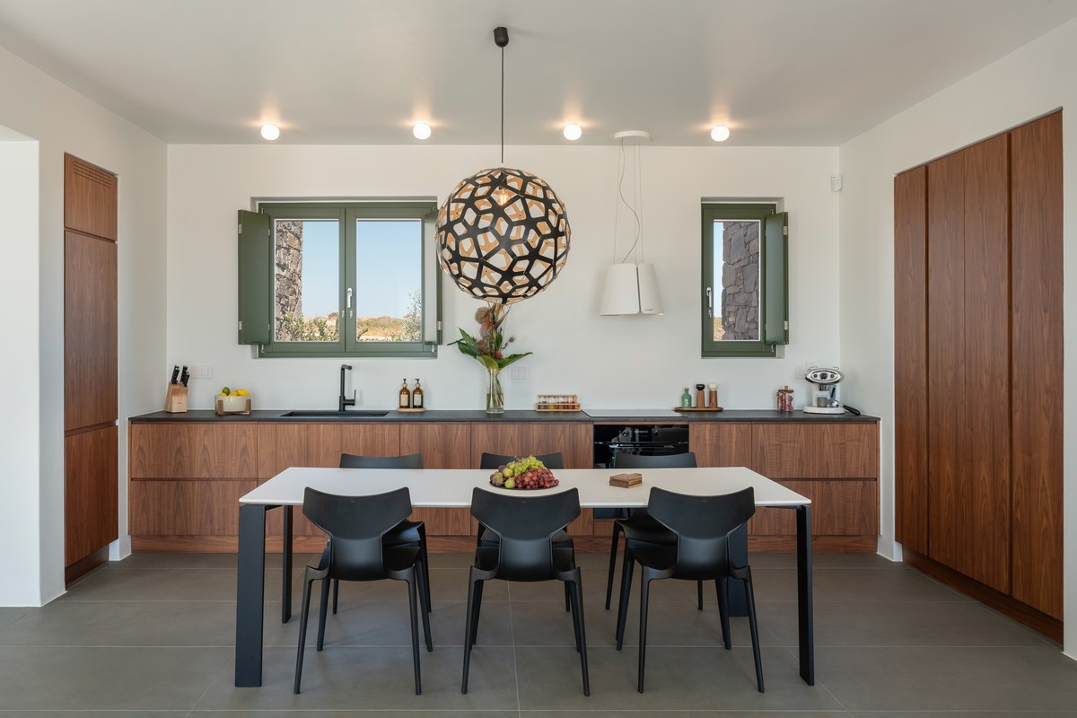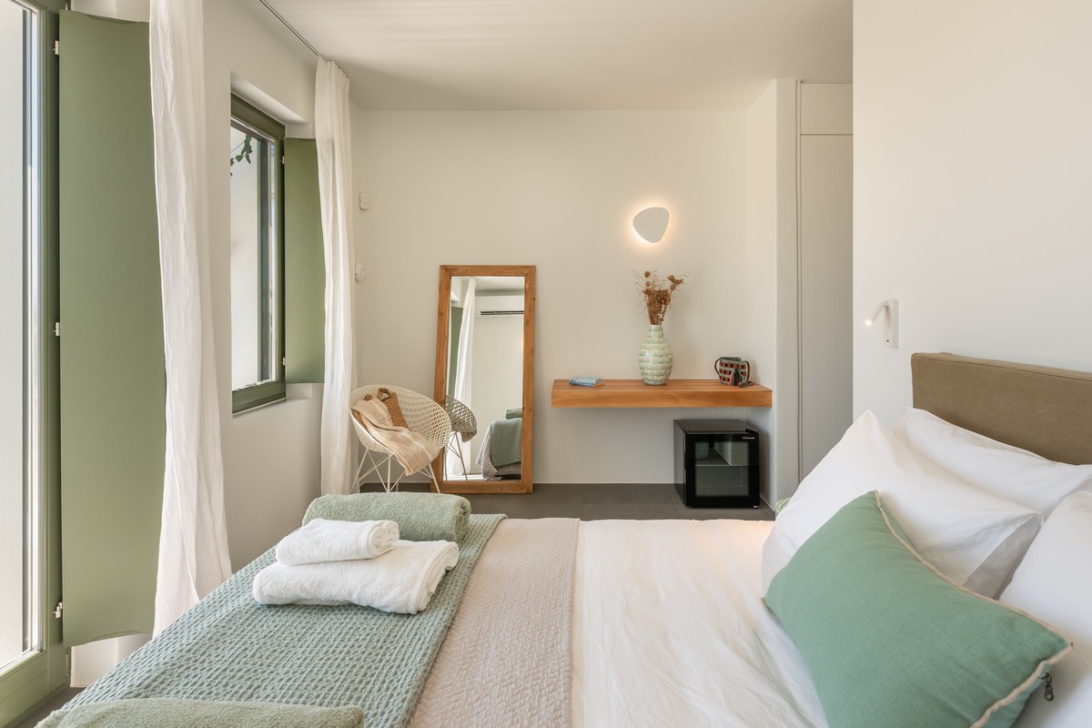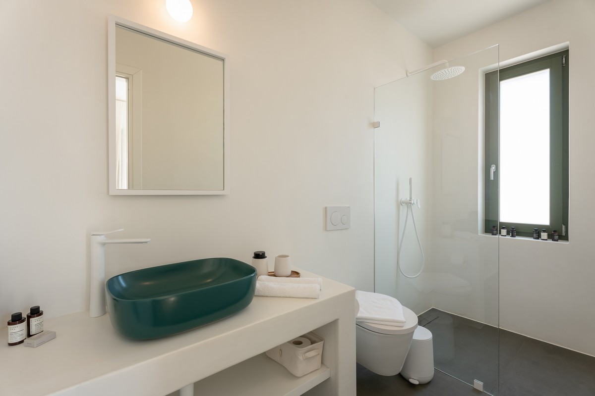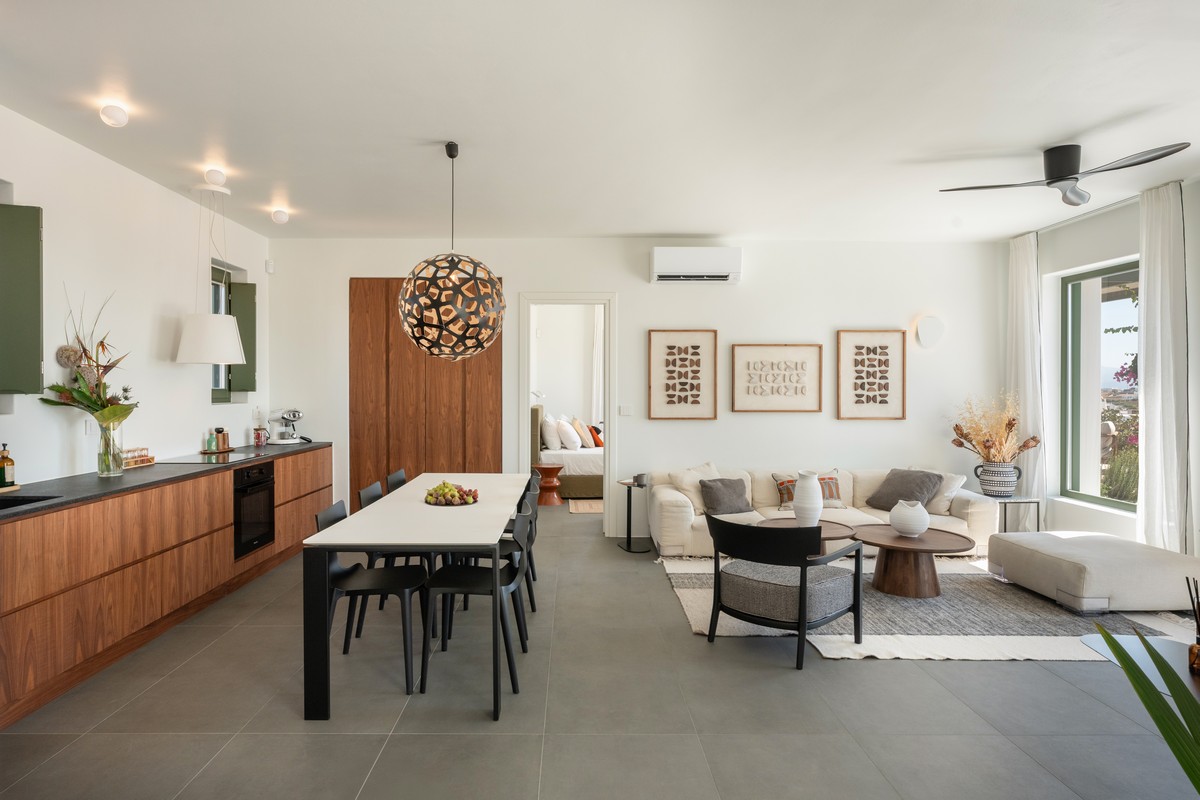 The property consists of a main house and two independent studios. The main house includes two bedrooms , one with a king-size bed and one with a queen-size bed , both with en-suite bathrooms, alongside a bright open-plan living and dining area and a fully equipped modern kitchen. Each of the two studios features a bedroom with a queen-size bed and en-suite bathroom. All bedrooms provide direct access to the pool and are designed with soft tones, natural materials, and large windows that fill the interiors with natural light, creating a serene and sophisticated atmosphere.